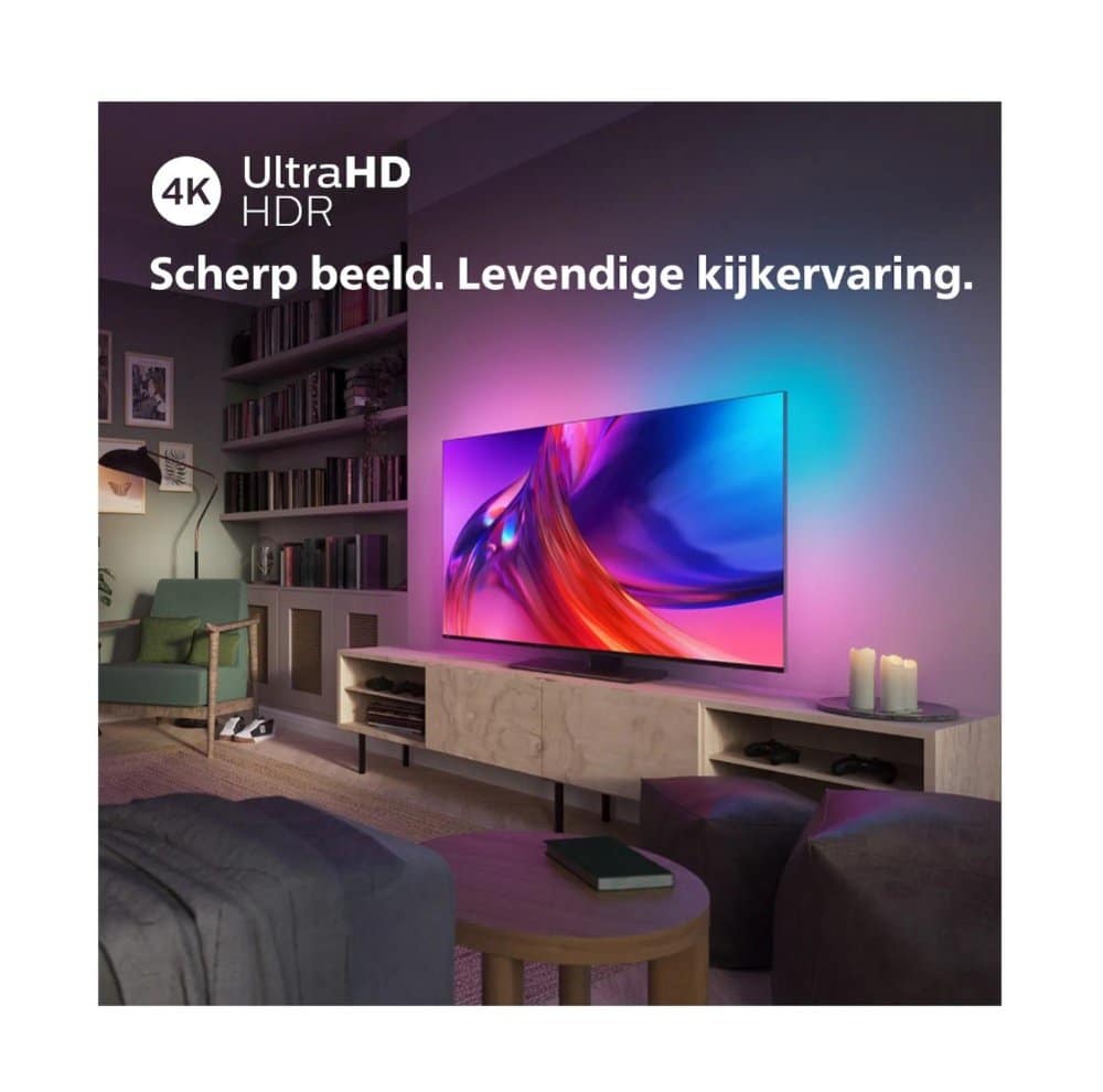 Met deze Philips The One 4K UHD-tv breng je de bioscoopervaring naar je eigen woonkamer, terwijl Ambilight je onderdompelt in een levendig en meeslepend visueel spektakel.
